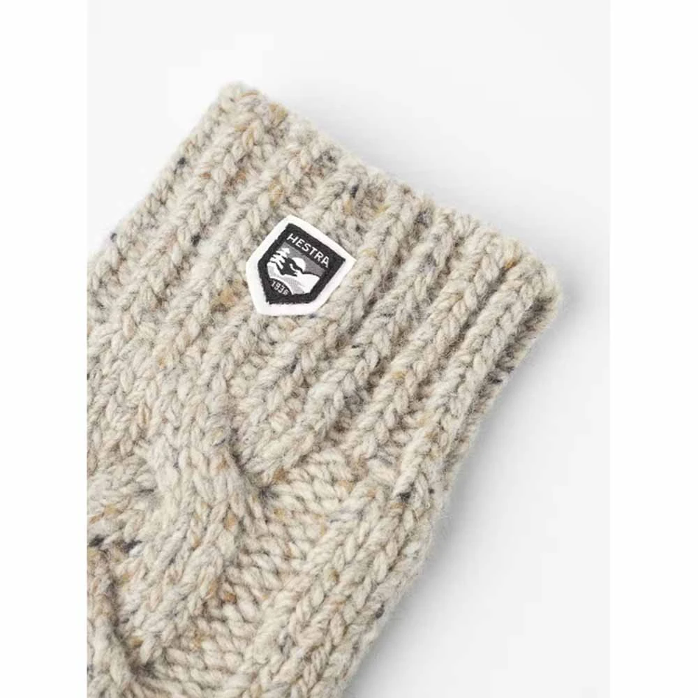 A soft, comfortable mitten with decorative braid knitting on the backhand. Knitted in a wonderful melange yarn of merino wool combined with alpaca wool and recycled polyamide for the perfect combination of softness and strength. Ribbed cuff with a small Hestra logo. A knitted wool blend lining provides extra warmth on chilly autumn and winter days.